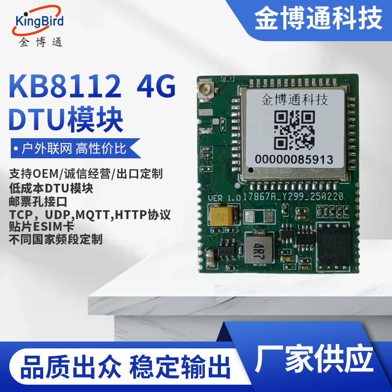隨著物聯(lián)網(wǎng)的發(fā)展,越來越多的用戶單位需要將自己的產(chǎn)品配上4G模塊來上物聯(lián)網(wǎng)系統(tǒng),但用戶買來4G模塊后,需要進(jìn)行軟件和硬件的開發(fā),這得必須配上一位軟件工程師和一位硬件工程師,而且產(chǎn)品從開發(fā)到成熟,至少要半年、一年甚至兩年的時間,人力成本至少要投入20萬,而且耗時又長。而我公司推出的KB8112 4G DTU模塊,是在4G模塊基礎(chǔ)之上將軟件,硬件(電源,天線,SIM卡等)全部開發(fā)成熟的4G DTU模塊,用戶可直接使用,無需軟硬件的開發(fā),它支持TCP/UDP/MQTT/HTTP的協(xié)議,而且成本低,體積小,含貼片ESIM卡(配四年的流量),郵票孔接口,方便用戶大批量的貼片生產(chǎn)。